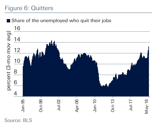 这体现在自愿性失业人数的增加。当劳动者开始追求比生产率更高的薪资水平时,他们会选择自愿性失业,跳槽来获取更高的报酬。美国劳工部的数据显示,目前美国自愿性失业的水平至少是2001年来的最高。