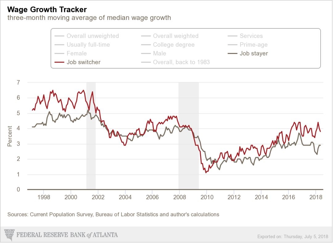 亚特兰大联储的薪资观测工具显示,跳槽者的薪资增速明显高于未跳槽者(3.8% VS 2.9%),而且二者的这种增速差距在今年以来更趋明显。