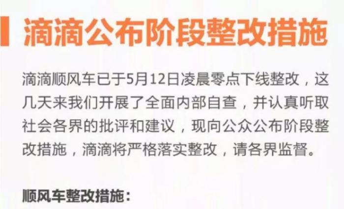 受舆论压力所迫,5月12日起,滴滴宣布下线顺风车业务一周,之后滴滴公布了顺风车整改措施。措施主要针对车主审核和社交化功能,包括隐藏双方头像、关闭评论、引入车主人脸识别、在APP中增添紧急求助按钮等具体改动。据内部人士透露,此前滴滴有意干脆取消顺风车业务。
