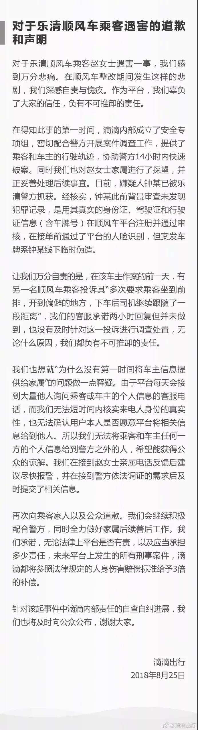 8月24日,20岁女孩坐滴滴顺风车遭奸杀,生前曾发微信向好友求救。对此25日,滴滴发布道歉和声明,称有不可推卸的责任,后续会积极配合警方,做好家属善后工作。