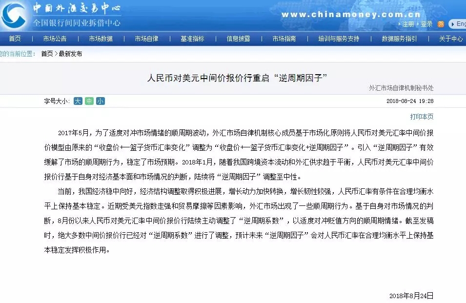 近期受美元指数走强和贸易摩擦等因素影响,外汇市场出现了一些顺周期行为。基于自身对市场情况的判断,8月份以来人民币对美元汇率中间价报价行陆续主动调整了“逆周期系数”,以适度对冲贬值方向的顺周期情绪。