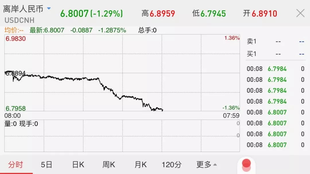 消息发布后,人民币晚间快速走高,离岸人民币兑美元一度大涨千点,收复6.80关口。截至发稿,离岸人民币报6.8007,涨幅达1.28%。