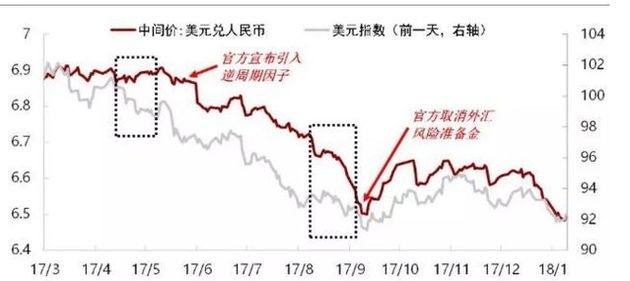 央行引入逆周期因子调节后,人民币持续贬值走势和市场主体贬值预期显著扭转,人民币兑美元汇率从5月初6.9左右出发,升值加速。自2017年5月26日至9月9日,人民币兑美元在岸和离岸汇率累计升值了近4000基点。人民币汇率指数也止跌回升。至年底兑美元已位于6.5左右。按官方口径计算,兑美元全年市场汇率升值6.72%,中间价升值6.16%。