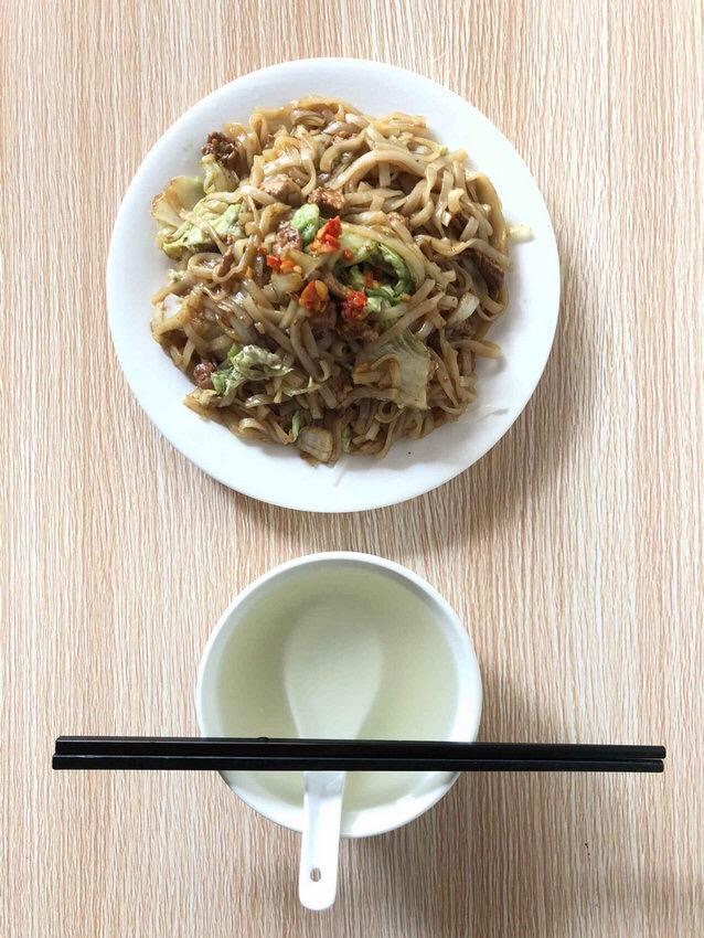 海南人习惯上午吃炒粉,这份炒粉9元,有肉,有菜,还有例汤。