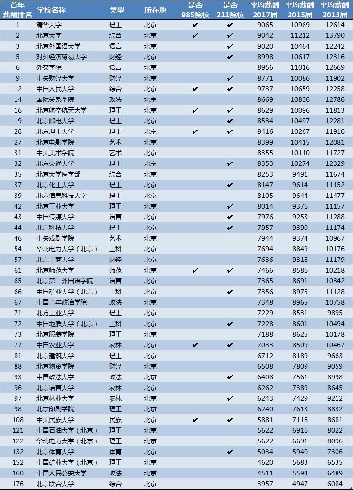 北京高校毕业生薪酬排行