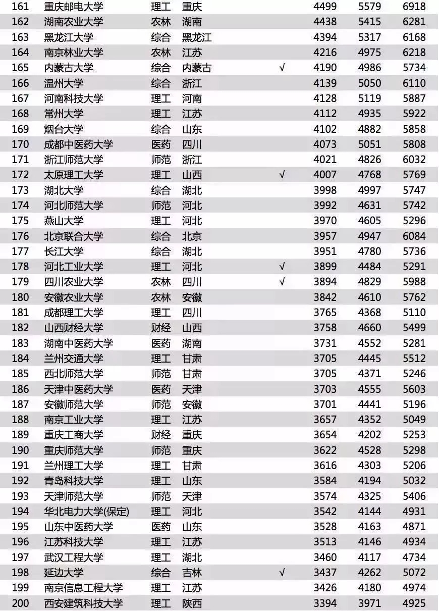 有些知名985高校如:武汉大学,湖南大学,重庆大学等排名比较靠后;但不能表明这些学校的毕业生工作不好,这样的工资水平在当地城市还是有很强竞争力的。