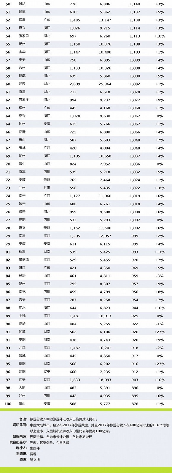 榜单中旅游人数最多的目的地城市依然是上海,人均消费是1251元,与去年相比,还下降2%,排在第43名,较去年下降了10位。旅游收入最多的目的地城市为北京,2017年旅游总收入为5469亿元,位列第十,人均旅游消费是1861元,较去年增长5%。