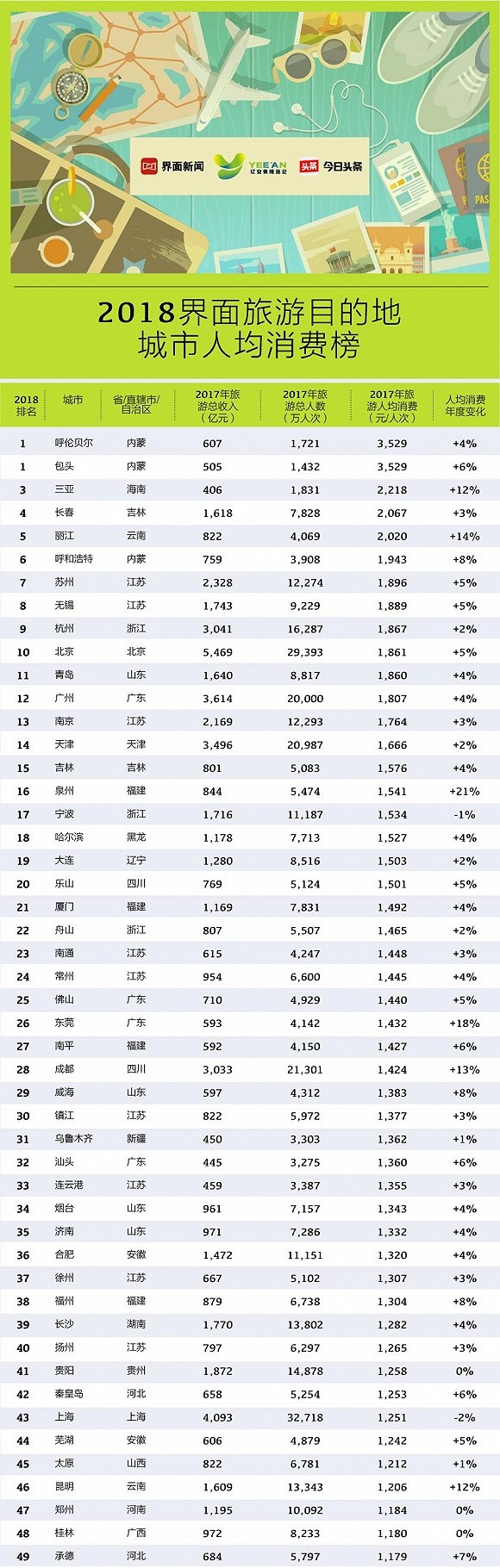 2018中国旅游目的地城市人均旅游消费榜出炉:内蒙真心贵,一些网红城市景美价廉玩法多