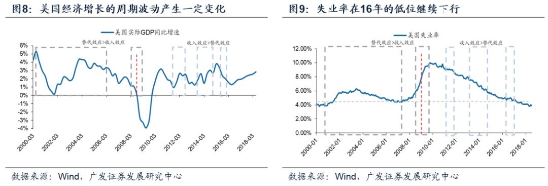 在收入效应>替代效应期间,尽管流动性极度宽松,但美国的通胀却处于下行阶段,或绝对值处于低位,通胀上行的预期并不强烈,利率被动抬升压力小。