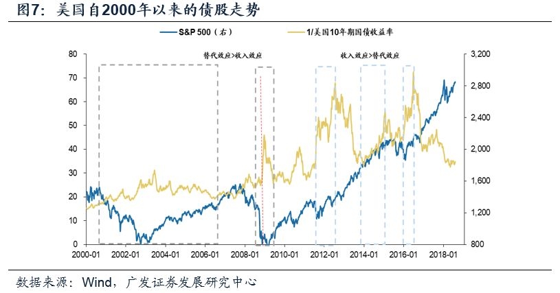 以美国为例,考察其2000年以来的债股表现情况,从长期角度来看,发现其在2000-2008年期间,多为债股反向变化,即债涨股跌或债跌股涨,替代效应>收入效应;但在2008-2016年期间,受量化宽松影响,则多为债股同向变化,即收入效应>替代效应。而在2016年确认进入加息通道后,再次呈现替代效应>收入效应的特征。