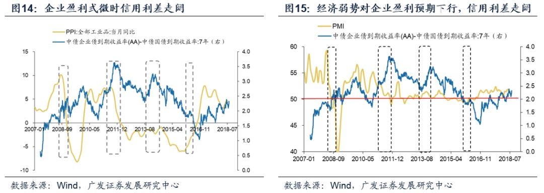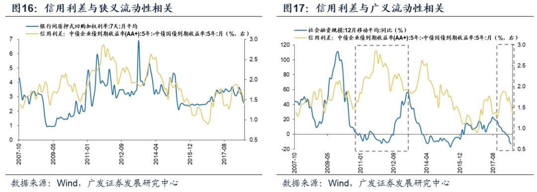 广义流动性(信用)的收紧或放松与狭义流动性(货币)又有所不同,信用收紧时,企业融资难度增加、融资成本上升,对现金流和盈利均造成负面影响,而融资难易程度本身就已通过信用评级的不同得以体现,在紧信用环境下,不同评级的企业间融资成本进一步分化,信用利差走阔。反之亦然。