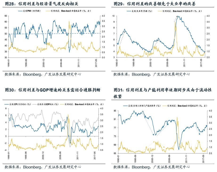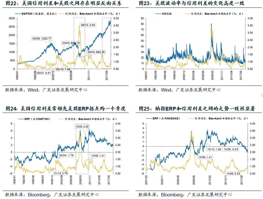 1)流动性整体平稳或收缩;2)通胀预期的趋势性强烈;3)经济周期趋势性强此外从信用利差看股票市场的风险溢价变化,我们发现美国信用利差拐点通常领先于美股风险溢价拐点3-4个月,具有较好的指示作用,但中国市场信用利差指示性偏弱,仅在“紧信用”环境变化为主要矛盾的环境中有较强的领先指标意义。随着未来打破刚兑和金融市场的不断成熟,信用利差的指示作用或将更为普适。