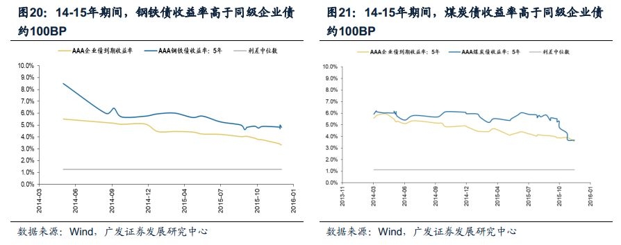 2015年以去产能、去库存、去杠杆、降成本、补短板为重点的供给侧结构性改革正式拉开大幕。但之前对于两高一剩产业的政策已经出现调整,落后和过程产能遭到淘汰,加杠杆扩产能受到限制。该类行业一般本身基本面和盈利状况便相对较弱,在产业政策变化后,相对于其他同评级信用债的利差进一步走阔。