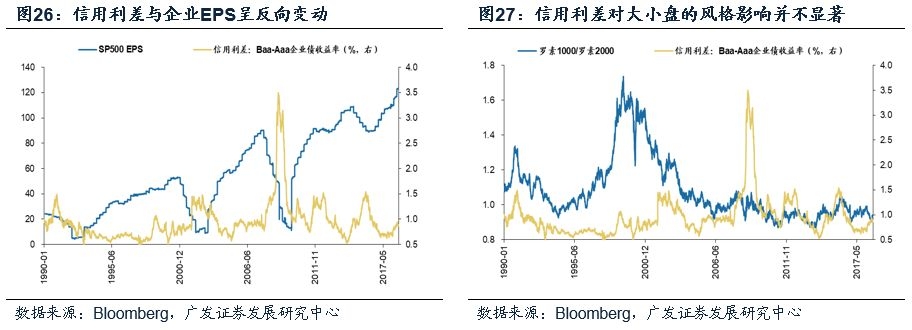 由于信用利差受宏观环境、企业盈利状况和市场流动性的影响较大,因此与股票市场的风险溢价应当存在一定的相关性。从美股市场来看,信用利差与股票市场的波动率和股票市场风险溢价的相关性强。且信用利差可看做股票的先行指标,尤其是在美股风险溢价上的适用性较好,美国信用利差拐点通常领先于美股风险溢价拐点3-4个月。在标普500指数上的可参考性较纳斯达克指数更强。但信用利差对于大小盘风格的指示作用并不明显。