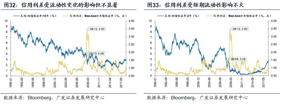 我们在前文所提到的影响信用利差的几重因素,在美国的信用利差变化上也得到了较好体现。从PMI、失业率、GDP增速、产能利用率等角度来看,经济景气度上行时信用利差收窄,经济景气度下行时信用利差走阔,但同时,也受到通胀的推动作用。以上市公司EPS变化来看信用利差,发现信用利差的拐点变化领先于EPS的拐点。由于失业率通常滞后于经济活动,信用利差对失业率的领先性较为明显。而作为经济景气度的另一同步指标,名义GDP增速与信用利差之间也具有负相关性,且因为经济上行同时通常伴随通胀上行,GDP增速与信用利差的负相关性进一步增强。以十年期国债利率判断流动性,信用利差与流动性呈现一定的负相关,但仅当流动性发生明显波动时,信用利差会受到影响;以两年期国债利率判断短期流动性,信用利差与短期流动性的相关性不显著。