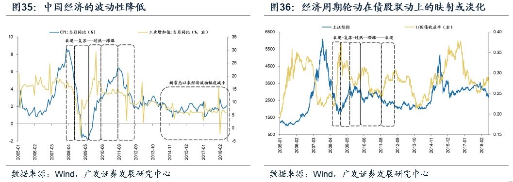 A股历史上几轮债股联动以替代效应为主,收入效应主要受流动性环境和投资意愿驱动,如2008年债股齐跌期间受投资意愿下行的拖累,以及2014年债股齐涨期间的流动性极度宽松。此外,新常态以来的经济波动性降低、中国逐步从“增量经济”迈入“存量经济”,经济周期轮动效应在债股联动上的映射预计将部分淡化。