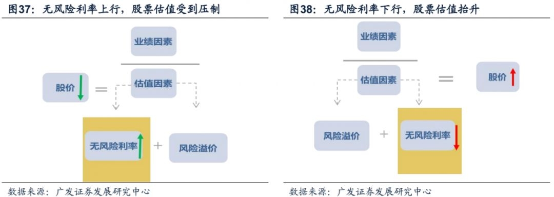 而从DDM模型来看,假设其他条件不变,在债券上涨利率下行时,股票估值模型的贴现率相应下行,估值抬升;在债券下跌利率上行时,股票的估值受到压制。但如前文所述,无风险利率变动与基本面高度相关,因此在折现率变动的同时,企业盈利也发生了变化,债股究竟是同向还是异向变动,从宏观和中观层面来看,与经济所处阶段和未来预期相关,从微观角度来解释,债股联动的方向与盈利和折现率的边际变化谁更显著息息相关。