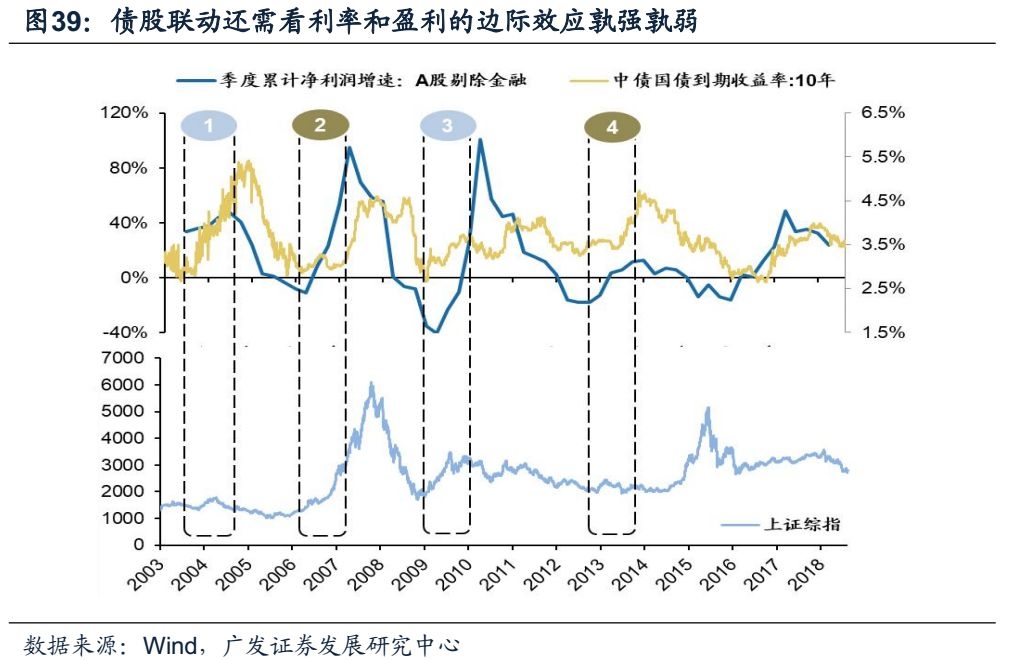 2004年期间,利率快速上行,而盈利增速在高位小幅上行,股票市场呈现震荡走势;2007年和2009年期间,利率小幅上行,盈利增速大幅,股票市场上涨趋势明显;而2013年,受去杠杆和钱荒影响,利率陡峭上行,而盈利增速虽然由负转正,但上行幅度有限,市场整体震荡偏弱。