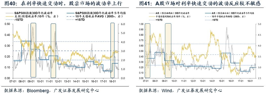 利率变化的节奏影响股票市场的波动率。从波动率来看,利率上行的斜率不同也会引起短期市场的变动。由于利率是一个高频变量而盈利是一个低频变量,在利率快速上行期间,股票市场的主要矛盾切换为快变量,市场整体的波动率上行,风险溢价上升。这一点在美股市场体现的更为明显,而在A股市场,通常存在一定滞后,即在利率变化(通常为上行)一段时间以后,股票市场的波动率上升。