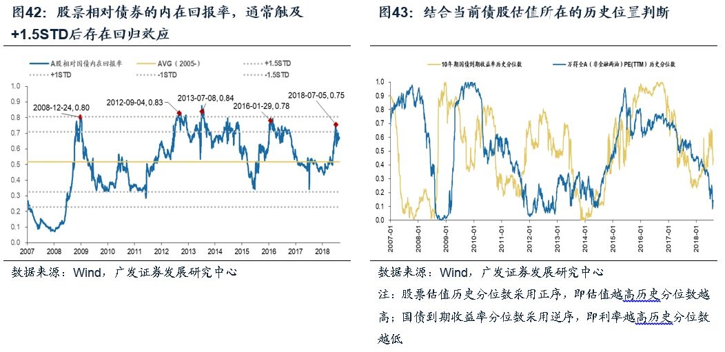 债股的相对吸引力也可成为大类资产配置中的重要指标。投资人追求投资的性价比:即收益/风险的比值,我们以1)股债相对内在回报率;2)债股历史分位数对比作为参考指标,来考量债股资产之间的相对吸引力。当A股相对国债的内在回报率上升,且估值处于历史低位时,股票资产的相对投资吸引力增强,从A股近十年的历史数据来看,股债相对回报率存在一定的均值回归效应,当A股相对债券内在回报率触及+1.5标准差之后(即股票估值处于底部),通常都会有所回落。