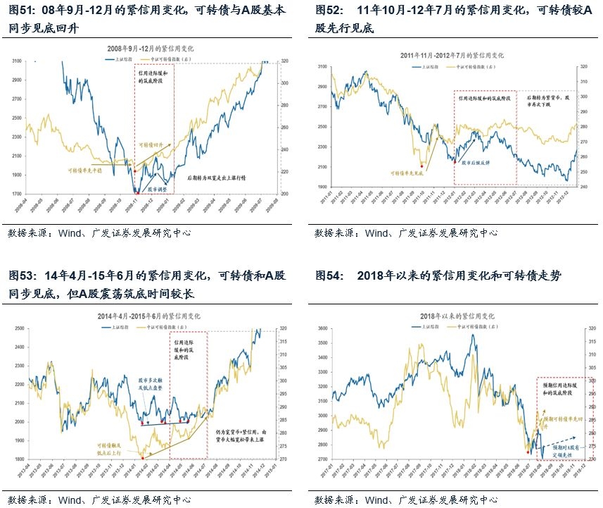 此外,从风险偏好的角度来看,可转债的变化也是一个相对A股较为领先的指标。回顾过去三轮“紧信用”下A股触底后,由信用边际缓和逐步走出底部的行情: