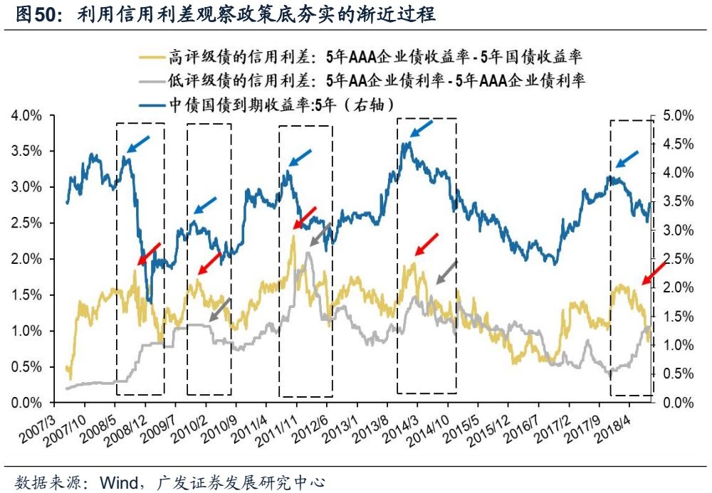 尽管历史验证上,信用利差变化对A股风险溢价和波动率的实时变化指示意义不强,但对于A股走出紧信用环境中的历史底部却有较强领先性。A股几次走出低点的路线,大多数情况是沿着“政策底→股市底→经济底”传导的,根据2008年以来的经验,“政策底”大致沿着“利率债→高等级信用债→低等级信用债”的路径传导。因此当观察到低评级信用债利率不再上升,则滞后“政策底”的“股价底”有望出现。