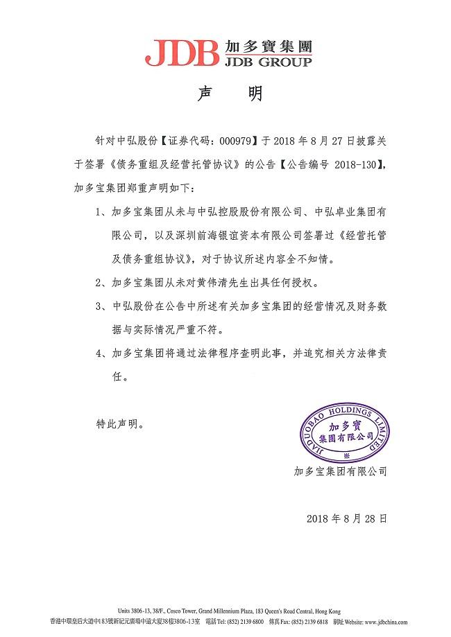 8月28日早间,就在中弘股份因上述消息而一字涨停板时,市场传出消息,加多宝集团发布关于澄清中弘股份《债务重组及经营托管》公告中不实内容的声明称,加多宝集团从未与中弘股份、中弘卓业集团有限公司、以及深圳前海银谊资本有限公司签署过《经营托管及债务重组协议》,对协议所述内容完全不知情。