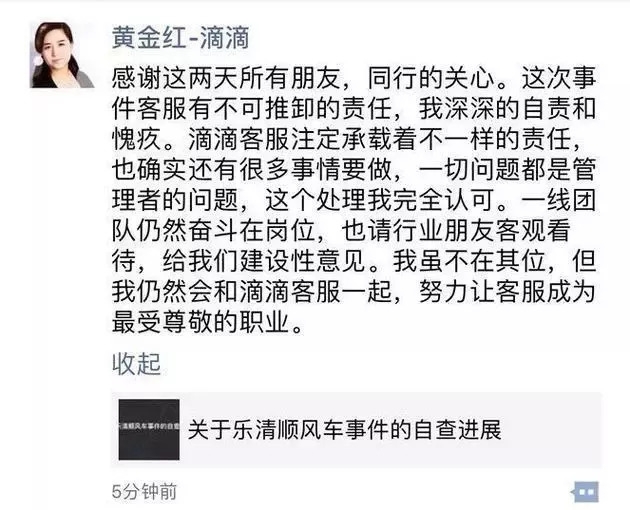 作为此次事件舆论焦点之一的客服部门副总裁黄金红昨天通过朋友圈表示:“这次事件客服有不可推卸的责任,我深深地自责和愧疚。滴滴客服注定承载着不一样的责任,也确实还有很多事情要做,一切问题都是管理者的问题,这个处理我完全认可。一线团队仍然奋斗在岗位,也请行业朋友客观看待,给我们建设性意见。”