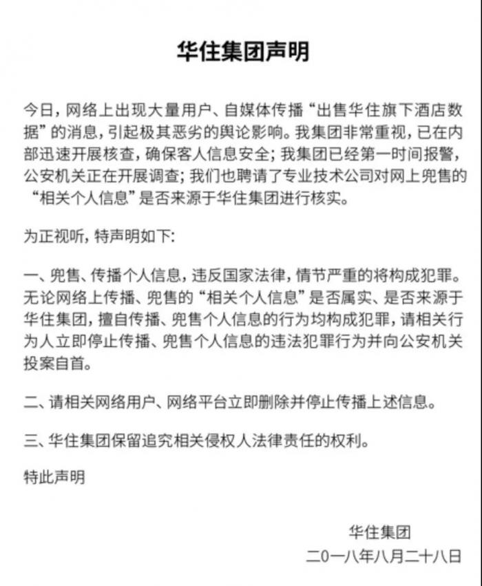 华住集团官方向《财经》记者回应称,已经收到了网上所有信息,并已经报警,并聘请专业技术公司对网上兜售的“相关个人信息是否属实”进行核实,有进展将随时公之于众。