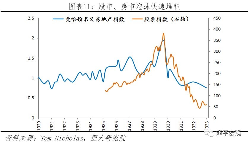 金融市场繁荣,投机盛行,股价房价齐升,资金脱实入虚。19世纪20年代的一系列经济增长、监管放松、金融创新等因素带动了资本市场的繁荣,股票市场上涨幅度远远领先于实体经济增速,虚高的收益率吸引大量海内外资本以及美国中产阶级投身投机热潮。1925-1929年,美国GDP增长15.1%,而同期道琼斯工业指数上涨202.3%。