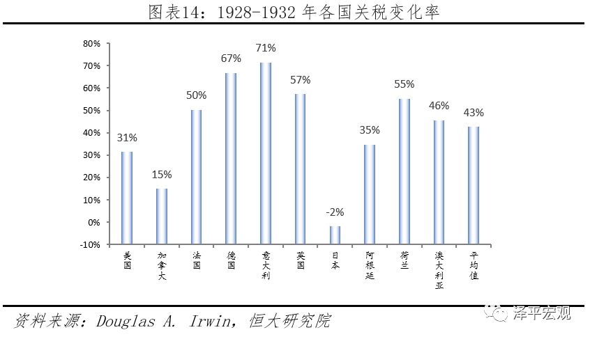 美国提高关税引发全球贸易战,出口大幅下滑延缓经济复苏。在我们前期报告《大萧条贸易战启示录》中指出,出于保护美国部分产业、缓和1929年美国股市崩盘带来的经济冲击影响以及金本位制约货币政策使用等主要原因,1929年美国国会通过《斯姆特-霍利关税法》,施加自1830年来100年内美国最高关税,将平均关税水平由40%提高至47%。此举引发全球贸易大战,各国竞相报复性提高关税,甚至施加进口配额限制、投资限制、竞相汇率贬值,导致国际贸易状况严重恶化,延缓了经济复苏。