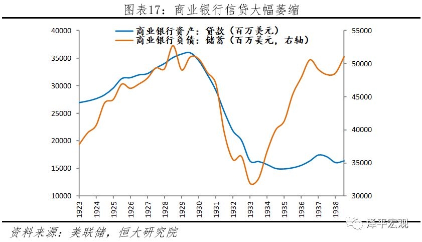 银行危机爆发,信用持续收缩,货币政策仍维持紧缩。1929年股市泡沫的崩溃引发美国银行业危机,信用紧缩,美联储多次下调再贴现率至1931年的1.5%,然而通货膨胀率高企导致实际利率持续上行,信用仍持续紧缩。随后美联储为维持金本位而于1931年10月再度提高再贴现率,同时仍奉行平衡财政原则未采取积极的财政政策挽救经济,此举加速了广义货币供应量的下降,市场利率急剧攀升,二度引发国内银行危机,大量银行因挤兑而倒闭,信贷极度萎缩,实体经济进一步陷入萧条的泥沼。