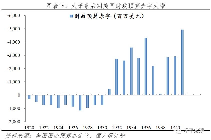 退出金本位解放货币政策,改革银行体系加强监管,财政发力改善经济。1933年新任美国总统罗斯福宣布退出金本位,解除货币锚定黄金对再通胀的约束,再贴现率从3.44%大幅降低至1.5%。同时,罗斯福还签署《格拉斯-斯蒂尔高法案》加强监管,规定商业银行分业经营,限制银行对证券资产投资,设立存款保险制度,提高银行系统稳定性。此外,加强政府对生产的控制,强调积极财政对经济的改善作用,平衡财政逐步转向功能财政。在一系列宏观政策调控下,美国经济开始逐步复苏。