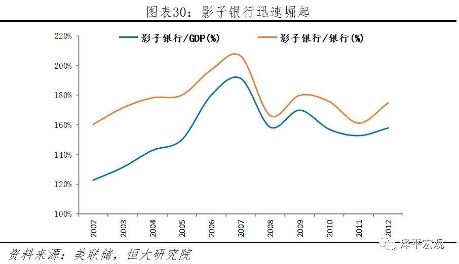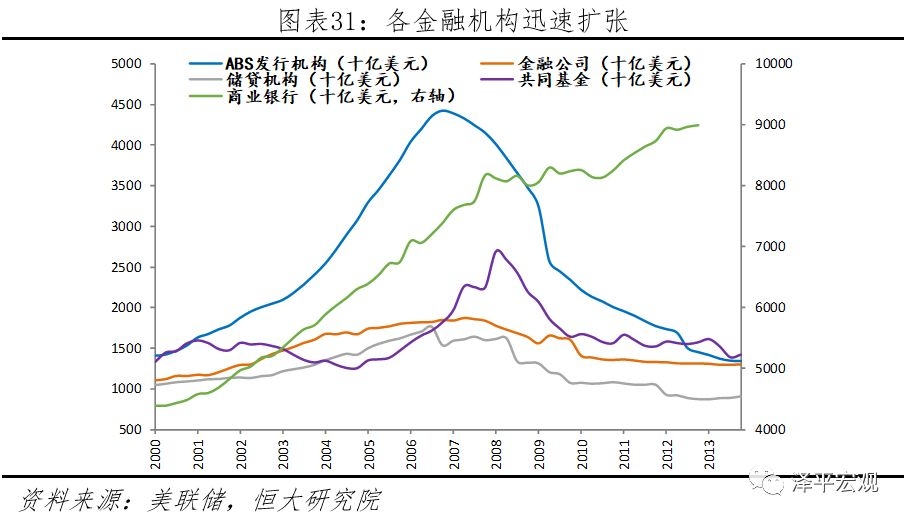 金融监管放松叠加鼓励金融创新,影子银行快速兴起。1998年美国废除《格拉斯-斯蒂格尔法案》,放开对商业银行、投资银行、保险等混业经营限制,监管逐步放松的同时鼓励金融自由、金融创新。在此条件下,以次级贷款为首的衍生信用产品快速扩张,大量商业银行、保险公司、共同基金、对冲基金以及金融公司纷纷扩展表外业务,处于监管真空领域的影子银行迅速扩张,规模巨幅提升。