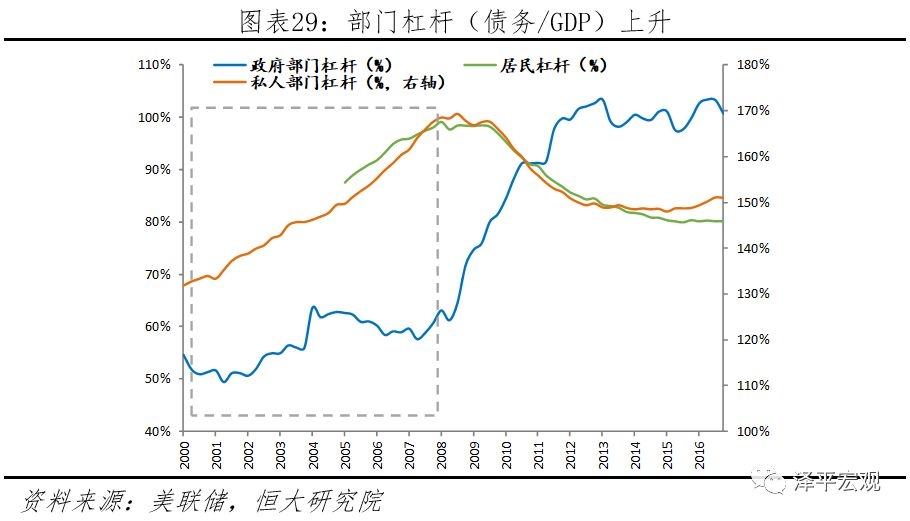 大幅下调基准利率,宽松货币刺激信贷扩张。2001年美国网络泡沫破灭叠加“911”事件冲击美国经实体济,美联储因此采取宽松货币政策,2001-2003年期间连续13次下调联邦基金利率至1%。在宽松货币、资金流出股市以及住房抵押贷款税收优惠政策的一系列刺激下,美国整体信贷大幅扩张,各部门杠杆率快速上升,大量资金涌入房地产市场,房产价格迅速上升。
