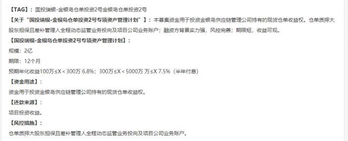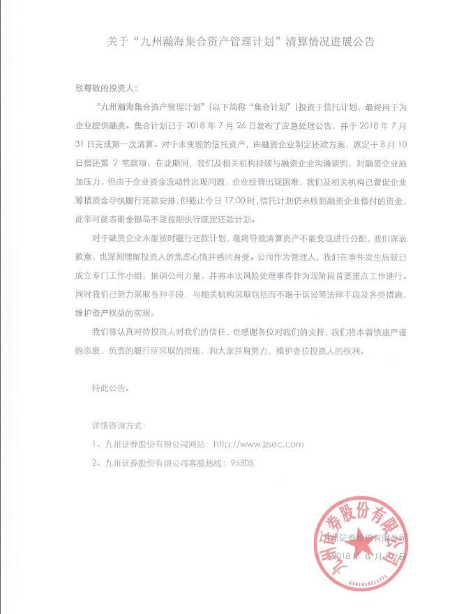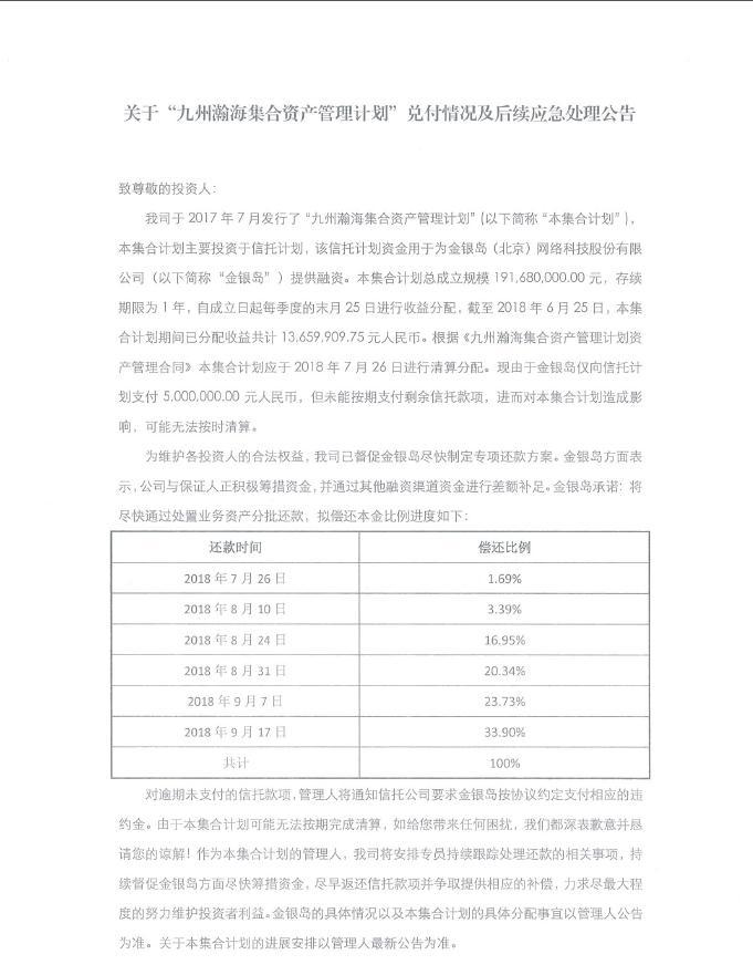 其中,“九州瀚海集合资产管理计划”成立于2017年7月,总成立规模1.92亿,存续期为1年。该集合计划投资于“中航信托.天启(2017)310号金银岛集合资金信托计划”,资金最终用于为金银岛(北京)网络科技股份有限公司(下称“金银岛”)提供融资。该集合计划自成立之日起每季度的末月25日进行收益分配,截至2018年6月25日,已分配收益供给1366万元。该集合计划期限1年,本应于2018年7月26日进行清算分配,由于截至目前金银岛仅向信托计划支付500万人民币,未能按期支付剩余款项,该计划无法按时清算。