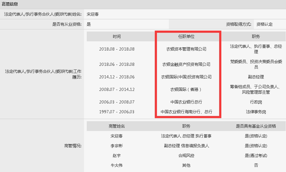 目前员工人数为5人。法定代表人为宋迎春,此前先后在中国农业银行总行、农银国际(香港)和农银国际(中国)投资有限公司担任职务。
