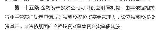 其中第二十五条明确指出,金融资产投资公司可以设立附属机构,由其依据相关行业主管部门规定申请成为私募股权投资基金管理人,设立私募股权投资基金,依法依规面向合格投资者募集资金实施债转股。