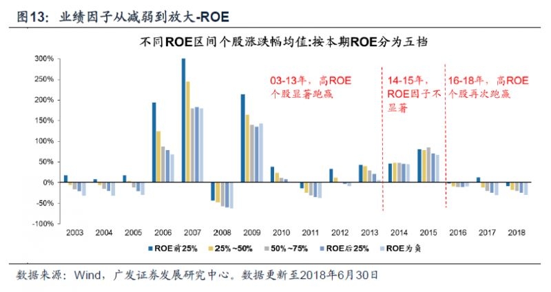 (3)A股业绩因子的演变——从净利润增速区间和ROE绝对值区间验证涨跌幅差异,A股大部分年份还是盈利驱动为主导的,印证了“美林投资时钟”的理论,即股市是经济周期(盈利)的“晴雨表”。03-13年经济周期处于大起大落的“增量模式”,盈利对股市的传导顺畅,高业绩公司跑赢低业绩(净利润增速划分、ROE绝对值划分);14-15年,中国经济面临“四万亿”之后产能严重过剩的“后遗症”,“存量模式”下盈利与股市的映射失效,业绩因子不显著,ROE对投资的指引淡化,并购逻辑支撑高业绩的主要集中在科创行业;16-17年,“供给侧改革”提升行业集中度,提高生产要素周转率,A股再度回到“盈利驱动”,高业绩公司持续占优。