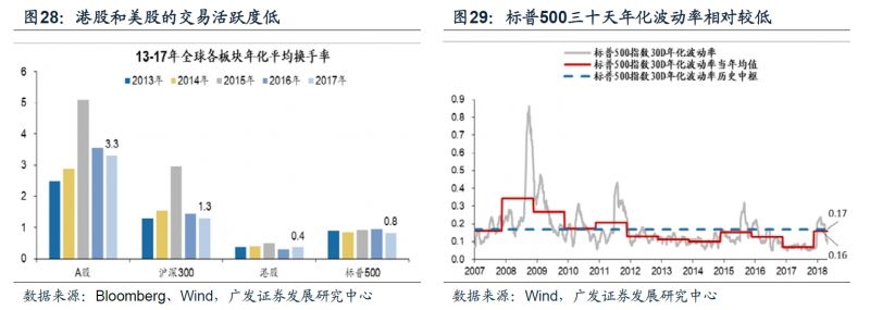 港股和美股的交易活跃度低,投资者倾向于中长期持有(buy-and-hold)。从13年以来年化换手率来看,A股整体持仓时长3.5个月,港股的整体持仓时长约为30个月,沪深300持仓时长9个月,而标普500的持仓时长约为15个月。因此美股与港股的年化波动率中枢相较A股更低。