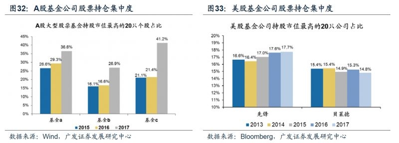 A股机构投资者博弈“相对收益”,持股集中度比海外较高。以美国最大的基金公司先锋与贝莱德为例,持股市值最重的20只公司的占比也就在15%-17%左右,而A股大型基金公司的持股集中度基本上在30%-40%以上。