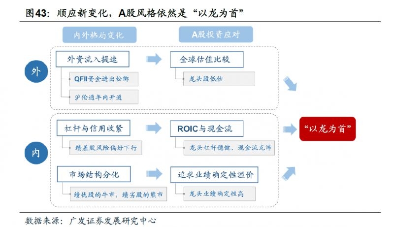 (1)知己知彼。看海外机构投资者的交易偏好如何影响A股风格,海外机构更偏爱“Buy-and-hold”,重视股息率与业绩而轻博弈估值波动;(2)由纵到横。外资流入加速使A股的估值体系完善,不仅局限于与历史估值的纵向比较,也应扩展至与全球估值的横向比较,搭建全球PB-ROE估值比较体系;(3)以龙为首。“去杠杆”使经营稳健的龙头业绩占优,“北上加速”使龙头估值在全球比较中占优,下一步A股龙头公司将从“确定性溢价”走向“估值溢价”。