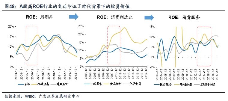 在传统的A股业绩分析框架中,净资产回报率(ROE)及其杜邦拆解三因子(资产周转率、资产负债率、销售利润率)是剖析企业内在盈利能力的重要指标。销售利润率衡量企业在产业链当中的议价权,资产负债率衡量企业加杠杆的能力,资产周转率衡量企业的生产效率。我们观察到,ROE趋势性抬升的行业往往是当时A股最具成长潜力和投资价值的行业。