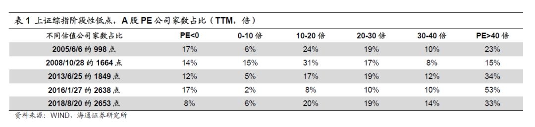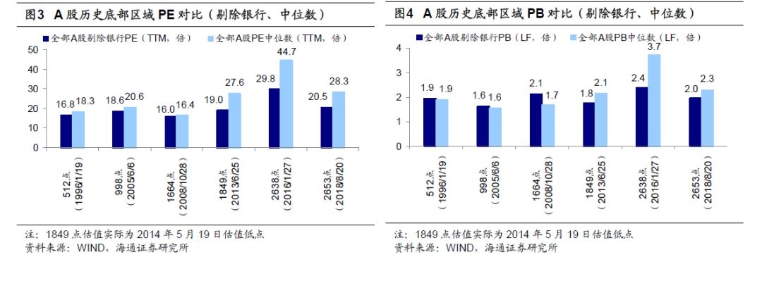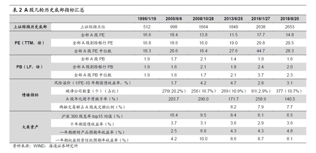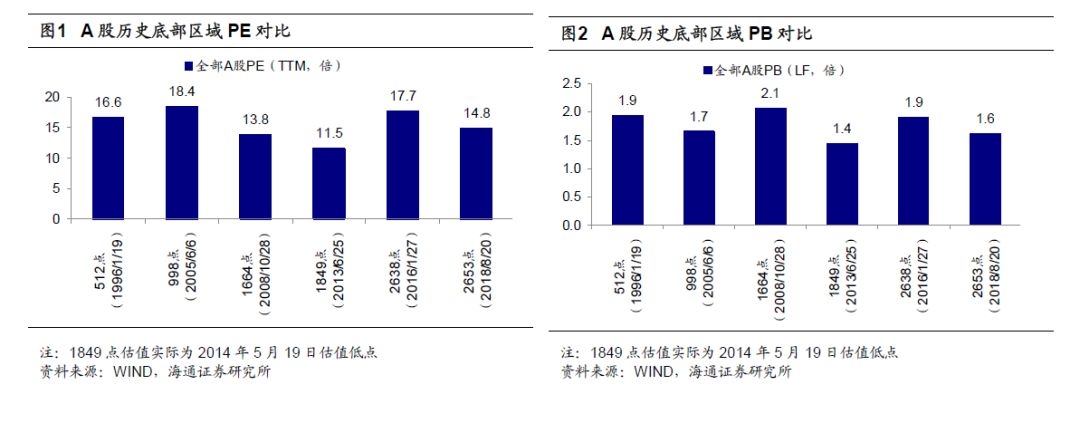 目前全部A股PE14.8倍处于历史底部区域。1990年以来A股经历了五轮牛熊周期,用上证综指刻画,前几次市场底部分别是1996年1月19日512点、2005年6月6日的998点、2008年10月28日的1664点、2013年6月25日的1849点。从PE/PB看,A股目前估值已与前几次市场底部相似。回顾前四次市场底部时期的特征:第一轮的低点(1996/1/19日的512点),这轮下跌始于1993/2/16日的1558点,累计跌幅-67%,历时3年,全部A股PE(TTM,下同)降至16.6倍,PB(LF,下同)为1.9倍;第二轮低点(2005/6/6日的998点),下跌始于2001年6月15日的2245点,累计跌幅-56%,历时4年,全部A股的PE降至18.4倍,PB为1.7倍;第三轮低点(2008/10/28的1664点),下跌始于2007年10月16日6124点,一路下跌1年,累计跌幅-73%,全部A股的PE最低降至13.8倍,PB为2.1倍;第四轮低点(2013/6/25的1849点),下跌始于2009年8月4日3487点,累计跌幅-47%,历时近4年,全部A股的PE在14年5月最低降至11.5倍,PB最低为1.4倍。2016年1月底上证综指2638点以来市场再次进入中长期圆弧底阶段,这轮调整从15/6/12高点5178点以来最大跌幅-49%,截至目前已持续约3年,全部A股PE、PB也分别降至最低14.8倍、1.6倍,较前四次市场底PE11.5~18.4倍、PB1.4~2.1倍,已基本接近。