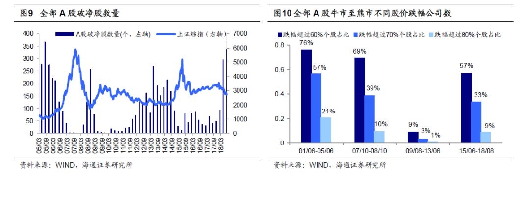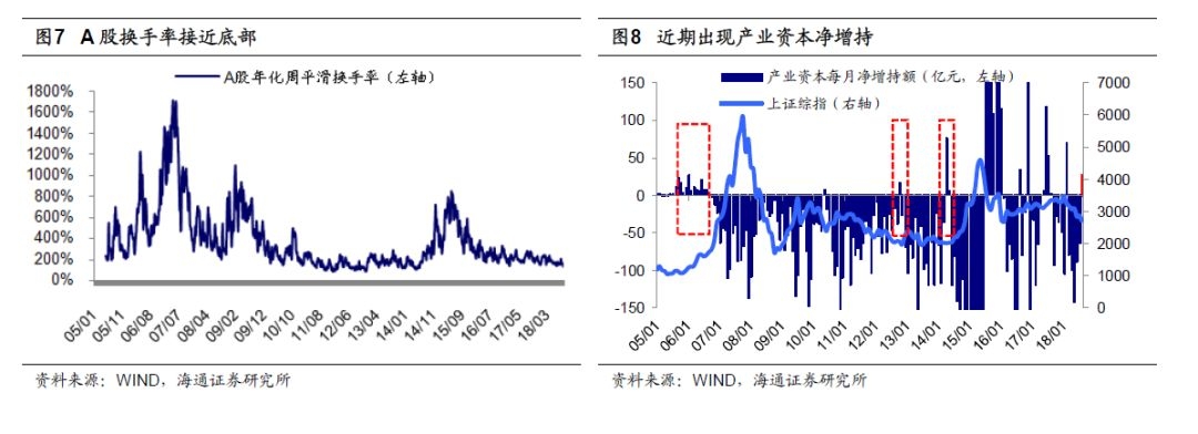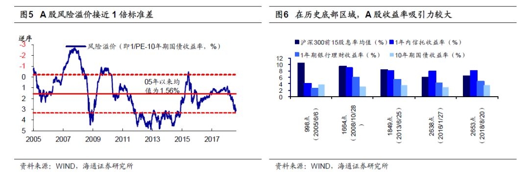 情绪指标显示风险溢价、换手率、个股破净数与跌幅接近前期底部水平。我们以1/全部A股PE-10年期国债到期收益率作为股市风险溢价的衡量指标,2005年以来的历史数据显示这一指标存在明显的均值回归特征,A股当前风险溢价为3.11%,远高于2005年以来的均值1.56%,接近2005年以来均值+1倍标准差3.33%。而回顾前几轮市场底部,2005/6/6的998点市场风险溢价为1.71%,2008/10/28的1664点为4.16%,2013/6/25的1849点为4.74%,2016/1/27的2638点为2.76%。从换手率看,截止2018/08/24,A股年化周平滑换手率为128%,较今年以来的均值182%已大幅下降,前四次市场底A股换手率分别为204%、290%、172%、259%。从两融交易额占A股成交额比重看,8月20日前后为7.7%,已低于2013年6月1849点前后的8.2%以及2016年1月2638点前后的7.9%。历史上,在市场底部区域A股破净股数量往往剧增,比如05Q2破净数占比为20.2%,08Q4为16.7%,13Q2为10.9%,16Q1为2.9%。今年三季度以来A股破净数(区间最低价/每股净资产<1)达到377家,占全部A股的10.7%,也接近前几次底部区域水平。此外回顾前三轮牛熊个股股价涨跌幅,从2001年6月牛市高点到2005年6月低点,全部A股股价跌幅超60%的个股占比76.4%,2007年10月牛市高点到2008年10月低点,占比69.1%,2009年8月牛市高点到2013年6月低点,占比9.03%,本轮自2015年6月牛市高点算起,占比为57.2%,也接近前期底部水平。