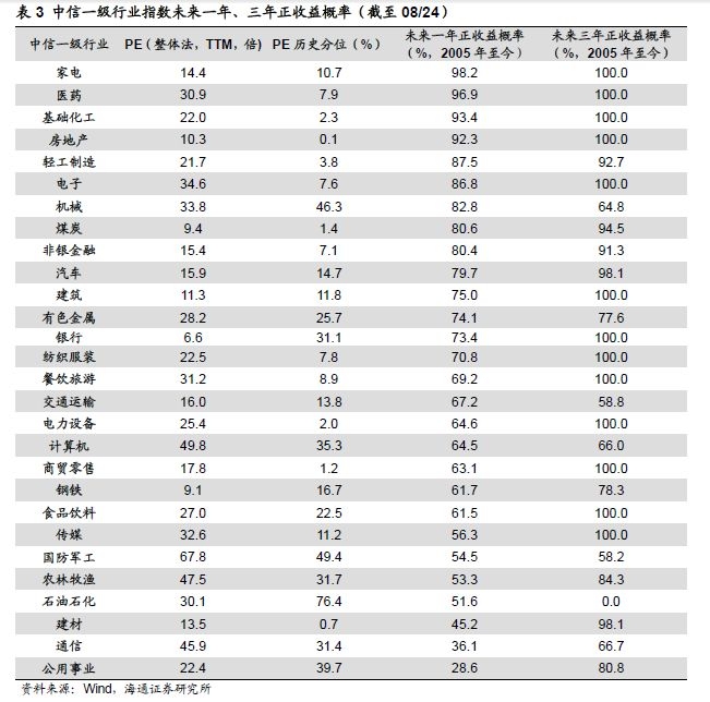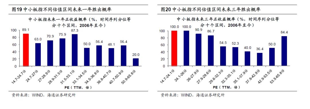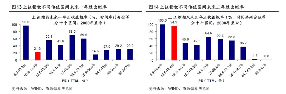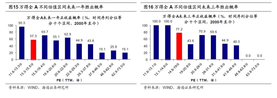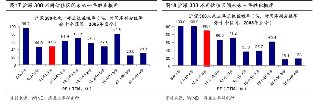 目前估值水平下,沪深300未来三年正收益概率88.7%。价值投资者和趋势投资者有不同的投资体系,趋势投资者要等待下跌趋势扭转,新的上涨力量出现后再进场,我们前期报告《磨底期的等待-20180819》提出市场情绪扭转至少需两大信号之一:一是去杠杆拐点,地方债务问题出台解决方案,二是改革加速,后续跟踪十九届四中全会。价值投资者则是评判目前的估值水平有无投资吸引力,了解主要市场指数估值水平后,我们尝试测算这一估值对应未来一定时间的涨跌概率。将2000年至今主要指数PE(TTM)按自下而上分位等分成十个区间,统计每一估值水平对应随后一年、三年涨跌幅。目前上证指数PE 12.3倍、未来一年正收益概率21.3%(对应PE10.8-13.5倍)、三年94.9%(对应PE10.6-12.4倍,具体分布详见下图)。万得全A目前PE 14.9倍,未来一年正收益概率57.3%、三年77.2%。沪深300目前PE 11.4倍,未来一年正收益概率47.6%、三年88.7%。中小板指PE23.0倍,未来一年正收益概率89.1%、三年100.0%。从三年中期视角看,目前A股主要市场指数均处估值低位,历史统计数据显示包括上证综指、万得全A、沪深300、中小板指未来三年正收益概率均在77%以上。按同样方法统计2005年至今中信一级行业指数目前PE对应未来一年、三年涨跌概率,未来一年正收益概率前五的行业是家电98.2%、医药 96.9%、基础化工 93.4%、房地产92.3%、轻工制造87.5%。未来三年正收益概率100%的有家电、医药、基础化工、房地产、电子、建筑、银行、纺织服装、餐饮旅游、电力设备、商贸零售、食品饮料、传媒。当然值得提示的是这一统计方法仅是对历史数据的回溯统计,历史规律不一定代表未来。