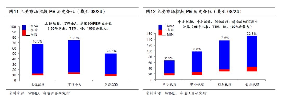目前市场估值结构与2013年上证综指1849点类似。市场对估值底的一个疑虑是整体估值虽低,但结构不好。首先从全部A股剔除银行PE\PB看,2005/6/6的998点PE18.6倍/PB1.6倍,2008/10/28的1664点16.0倍/2.1倍,2013/6/25的1849点19.0倍/1.8倍,2016/1/27的2638点29.8倍/2.4倍,目前(08/20)全部A股剔除银行PE20.5倍、PB 2.0倍已基本接近底部水平。从全部A股估值中位数看,前四次PE/PB分别为20.6倍/1.6倍、16.4倍/1.7倍、27.6倍/2.1倍、44.7倍/3.7倍,目前中位数PE 28.3倍、PB 2.3倍也基本接近,若按照2013年6月2445只股票进行单独统计,目前PB中位数1.9倍已低于当时估值水平。从估值分布看,目前估值结构比2638点更合理,与1849点类似,全部A股PE处在0-10倍的家数占比目前为6%(1849点5%,下同),10-20倍为20%(17%),20-30倍为19%(19%),30-40倍为14%(12%),40倍以上为33%(34%),0倍以下为8%(12%)。这样的估值结构意味着市场里有45%的股票PE位于0-30倍区间,比较前几轮市场底部,2005/6/6的998点PE位于0-30倍区间的股票有49%,2008/10/28的1664点有63%,2013/6/25的1849点有41%,2016/1/27的2638点有20%。这样的估值结构使得市场有一个相对稳定扎实的底部。