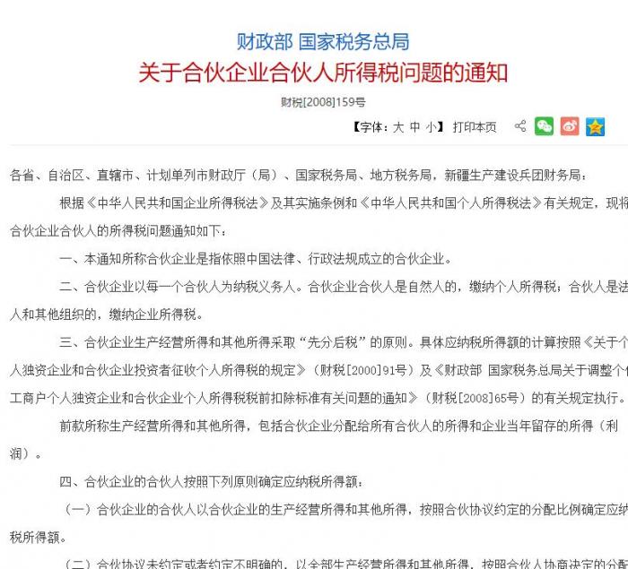 在财政部、国家税务总局发布的《关于合伙企业合伙人所得税问题的通知》(财税[2008]159号,下称“159号文”)中规定:合伙企业以每一个合伙人为纳税义务人。合伙企业合伙人是自然人的,缴纳个人所得税;合伙人是法人和其他组织的,缴纳企业所得税。