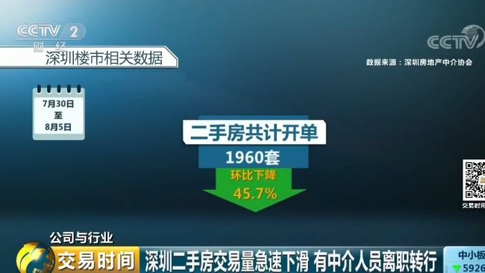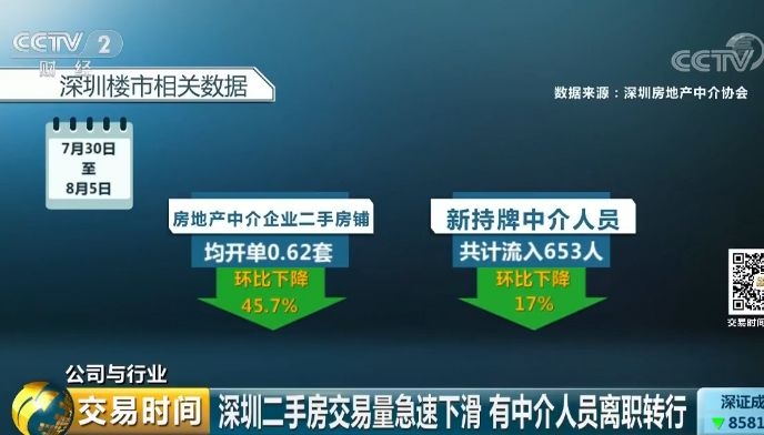 深圳房地产中介协会中介行业标准指数显示,新政第一周全市房地产中介企业二手房铺均开单0.62套,环比下降45.7%;深圳新持牌中介人员共计流入653人,环比下降17%;