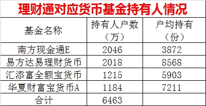 其中,南方现金通E和易方达易理财货币的持有人户数超过2000万大关,分别为2046万户和2018万户,户均持有金额则是易方达的最大,达到了8568份,也就对应8568元。